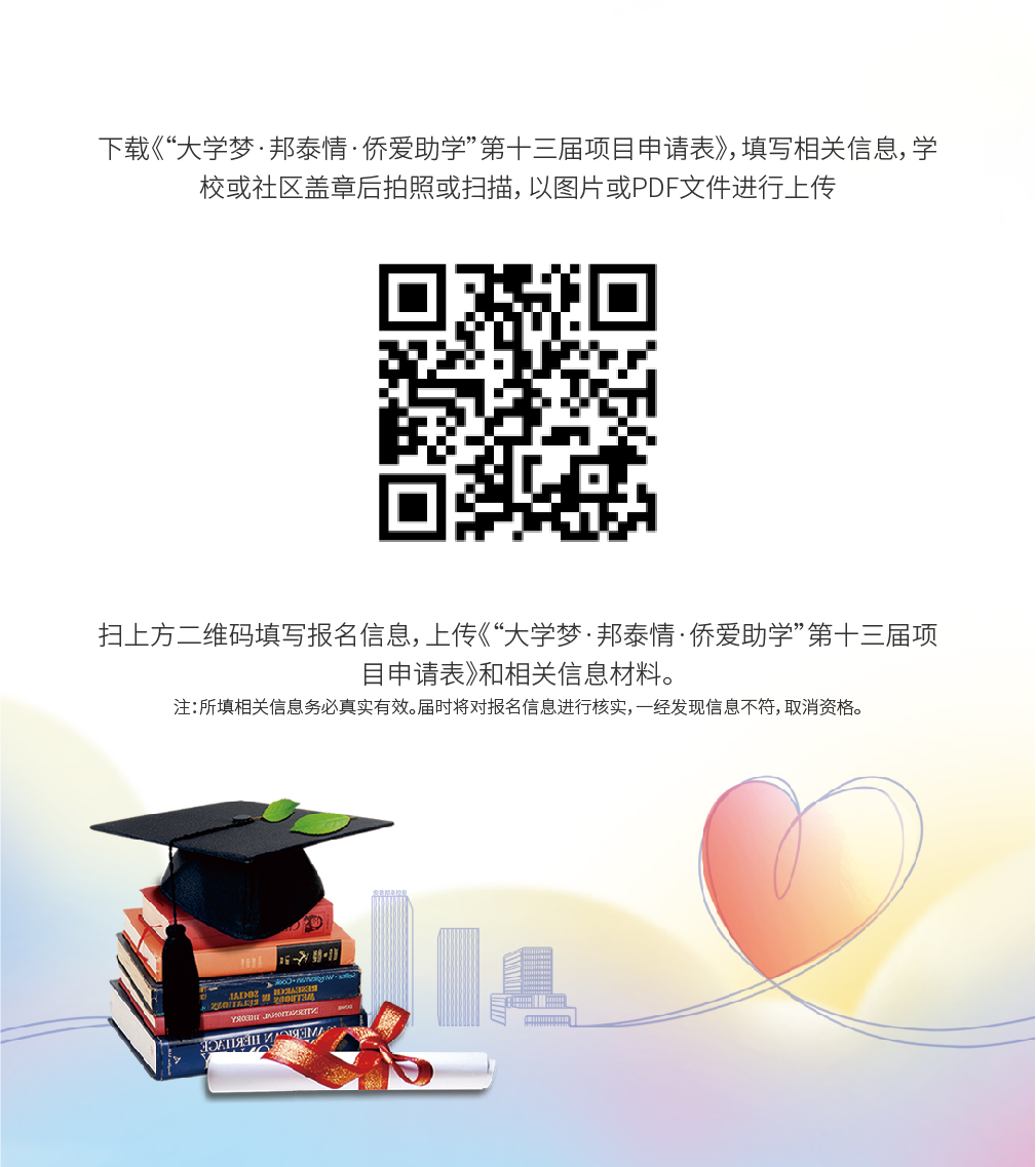 符合资助条件的大学新生,持大学录取通知书(或成绩单)、身份证、户口簿和低保证、家庭收入声明(非低保家庭)或直系亲属患重大疾病医疗费用(近一年内)清单的复印件,并按要求如实填写《“大学梦·邦泰情·侨爱助学”第十三届项目申请表》。